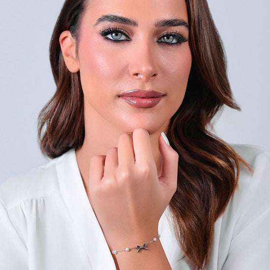 Bracciale Donna in acciaio con perle sintetiche bianche e fiocco. Lunghezza: 16 + 3 cm. Diametro perle: 4 mm. Misura fiocco: 12 x 7,5 mm. Raffinato ed elegante, questo bracciale da donna in acciaio unisce la classicità delle perle bianche con la grazia di un delicato fiocco, creando un accessorio femminile e sofisticato. Le perle, simbolo di eleganza senza tempo, donano luce e raffinatezza, mentre il fiocco aggiunge un tocco romantico e originale, perfetto per completare qualsiasi look.